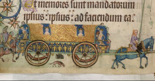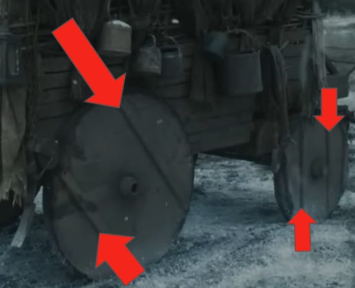 I’m aware that if one googles “medieval cart wheel” or “medieval cart” one will get a few hits that use this wood plank wheel model. But I am extremely skeptical of these results: all the putatively medieval wood plank wheels are of modern constructions. They look like they’re meant to appear antiquated but are in fact not, which is exactly what I’m hypothesizing happened with Rings of Power.