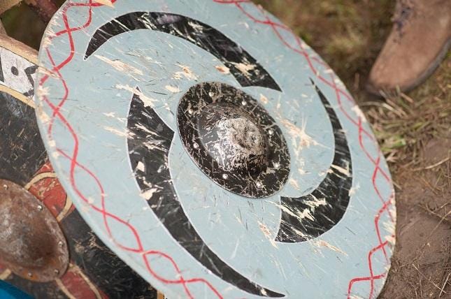 Here is where we see plank wood shaped into a perfectly round, perfectly flat form around a metal hub.3 Its design allowed it to effectively be used in a shield wall formation.4 Some researchers even hypothesize that this flat, round face was chosen so enemy weapons would “catch” in the wood and stick so that with a twist of the shieldbearer’s wrist the weapon could be wrenched away from the adversary.