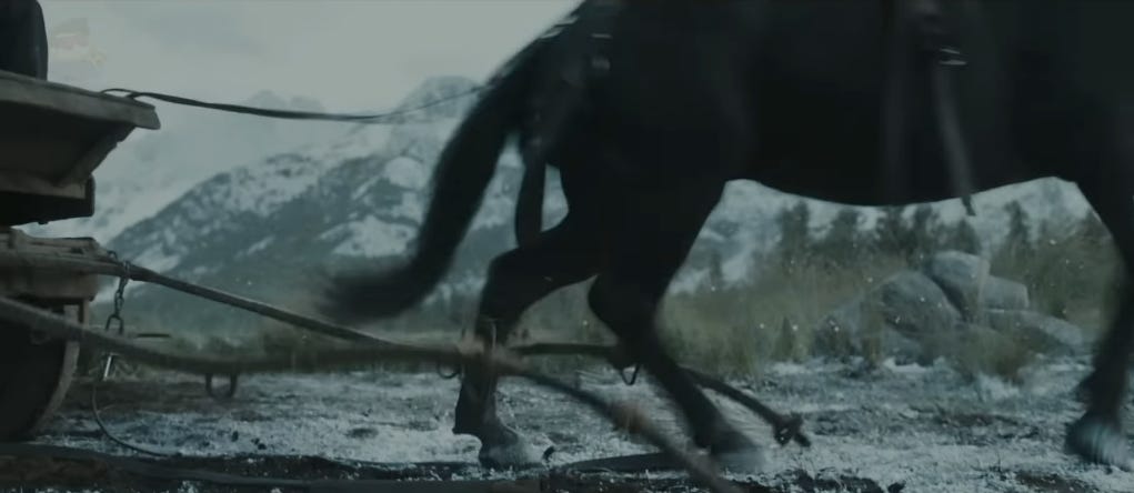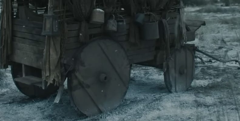 The wagon is onscreen for about a minute and a half, and any of what we’ve discussed could be incorporated in that same amount of time to great effect. Had the decision-makers sat down to critically think about this wagon business and compare it to the available historical counterparts, they might have arrived at not only something more logical, but something that resonated as an event that could be believed in.